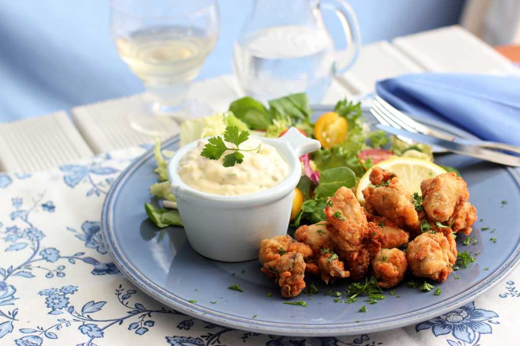 - Кальмары под оригинальной приправой. Соус готовят на основе сметаны, смешанной с майонезом. Тушки кальмаров (50-80 г) нарезают кольцами, а плавники — соломкой. Взбивают яйцо с 1 ст. л. молока и 175 г панировочных сухарей, обжаривают морепродукты на сковороде столько времени, чтобы они покрылись румяной корочкой. В тартар добавляют мелконарезанные каперсы или соленые огурцы. Соус подают холодным, а кальмары — горячими.