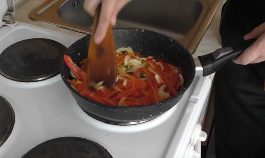 Режем лук мелко, высыпаем в оливковое масло, обжариваем. Добавляем порезанный полосками перец, готовим 3-4 минутки.