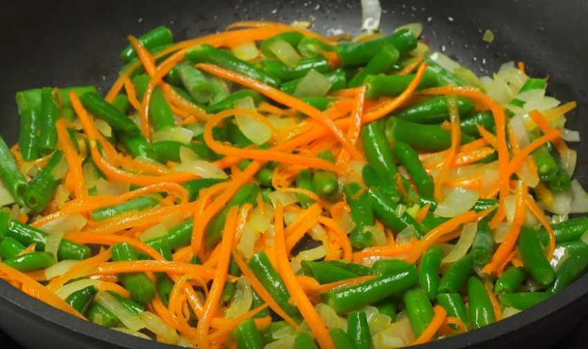 На растительном масле обжариваем нарезанный лук, добавляем к нему морковь, порезанную тоненькими кружками. Готовим три минутки, добавляем томатную пасту, обжариваем, вводим стручковую фасоль. Если она была замороженная, то отваривать не нужно.