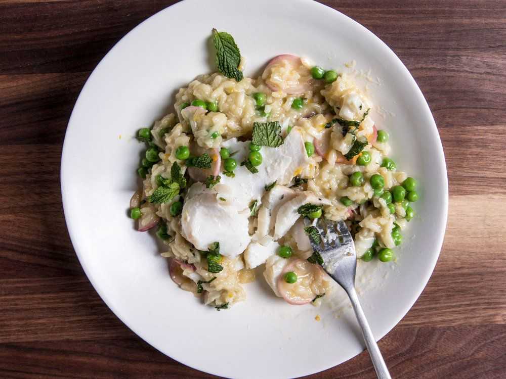 Ризотто: для приготовления ризотто рис (лучше использовать сорта «арборио» или «карнароли») нужно обжарить на оливковом масле до золотистого цвета с чесноком и тимьяном, добавить белое сухое вино и грибной бульон. Варить 6-7 минут. Отдельно обжарьте очищенные белые грибы (свежие или замороженные) с луком-шалотом. Добавить к подготовленному рису, добавить морскую соль и черный перец, варить ризотто еще 7-8 минут, пока рис не станет «al dente», постоянно добавляя грибной бульон .