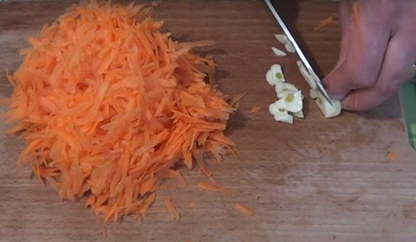 3. Приготовьте овощную заправку. Нарежьте лук полукольцами, морковь – соломкой или натрите на терке, покрошите зубцы чеснока не очень мелкими кусочками.