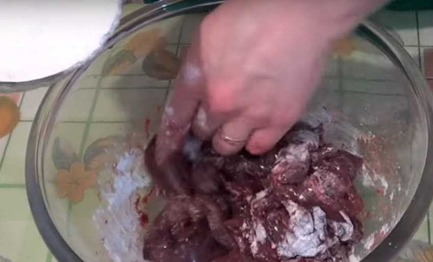 - Для образования хрустящей корочке куски нарезанной печени обмакивают в муке.