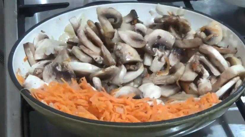 - Грибы нашинковать полукольцами, перемешать с обжаренным луком в сковороде.