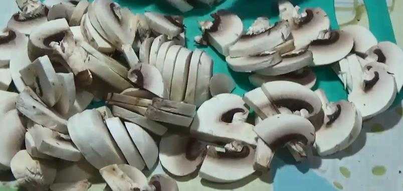 - Грибы промываются, чистятся и отвариваются, затем нарезаются слайсами и обжариваются в масле до готовности.