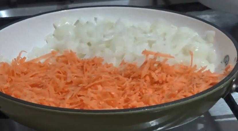 - Лук и грибные ножки нарубить мелкими кубиками, обжарить на постном масле до румяности.