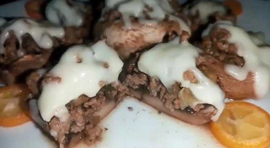 Вкусным получается блюдо, если просто обжарить грибные шляпки с начинкой или же протушить их, залив сметанным соусом. В этом случае они получаются намного нежнее классического варианта, а оставшийся соус можно использовать в других блюдах. Довольно изысканная закуска выходит, если притрусить шляпки со стороны фарша легкоплавкими сортами сыра.