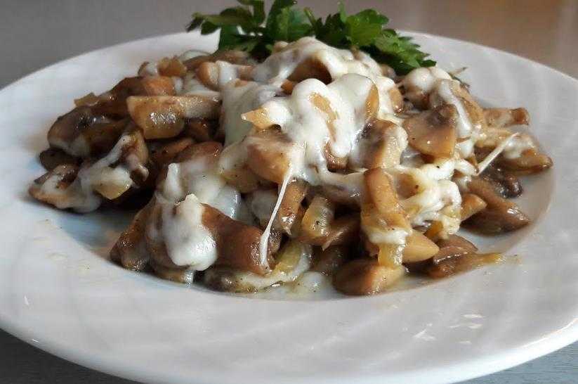 Жареные шампиньоны с луком и сыром на сковороде