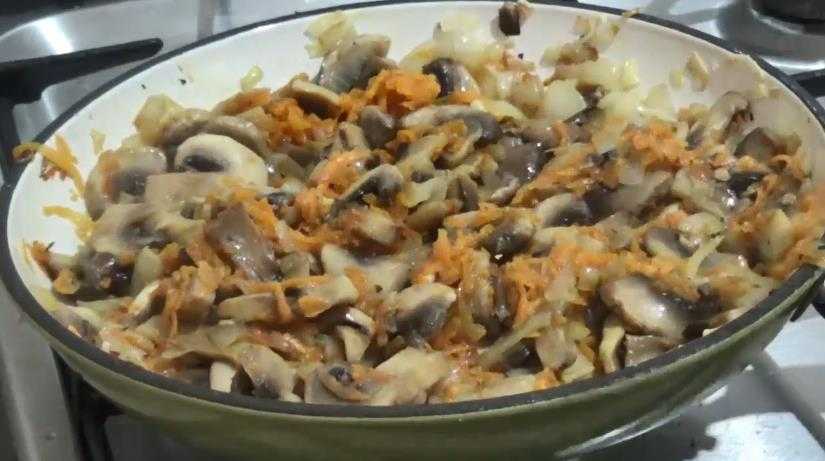 - Отдельно обжаривается порезанный колечками лук и смешивается с грибами.