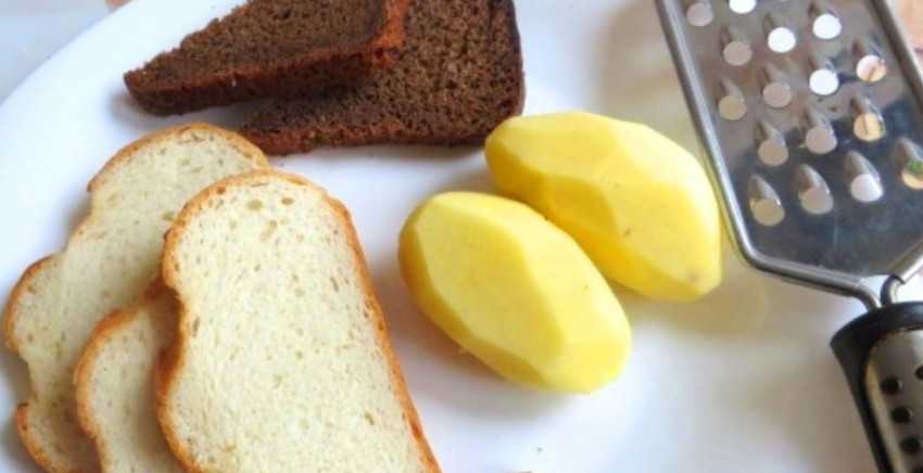 1. Картофель потрите на крупной терке, хлеб нарежьте ломтиками.