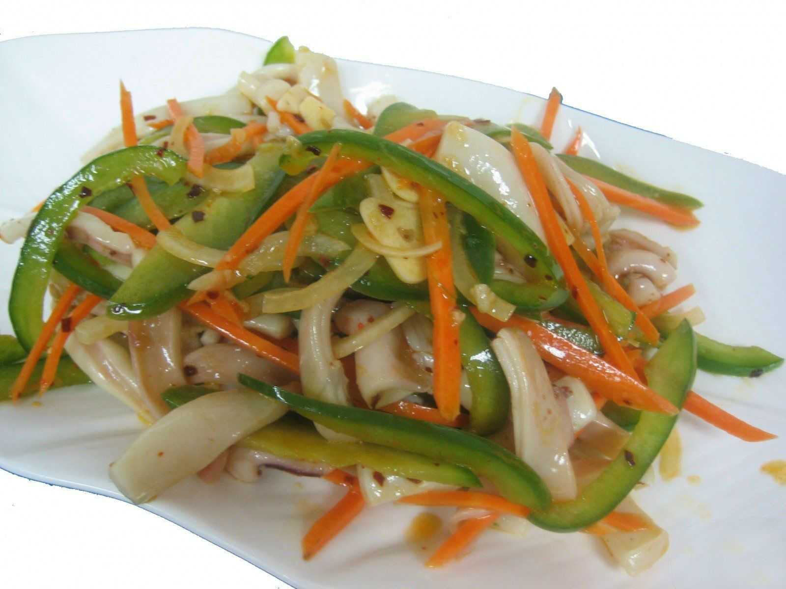 Кальмара нужно сварить в немного подсоленной воде. Когда остынет, нарезать полосками.