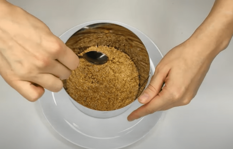 - Печенье превращаем в крошку удобным способом. Масло растапливаем в микроволновке или на плите. Соединяем масло и крошку, выкладываем на дно формы, утрамбовываем. Убираем в холод.