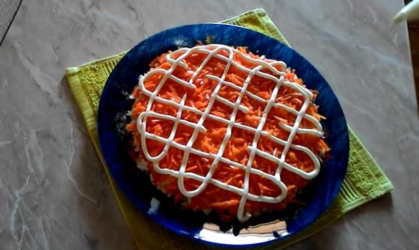 8. Затем слой шампиньонов и на них нанести тонкий слой майонеза, слой моркови чуть присолить и смазать майонезом.
