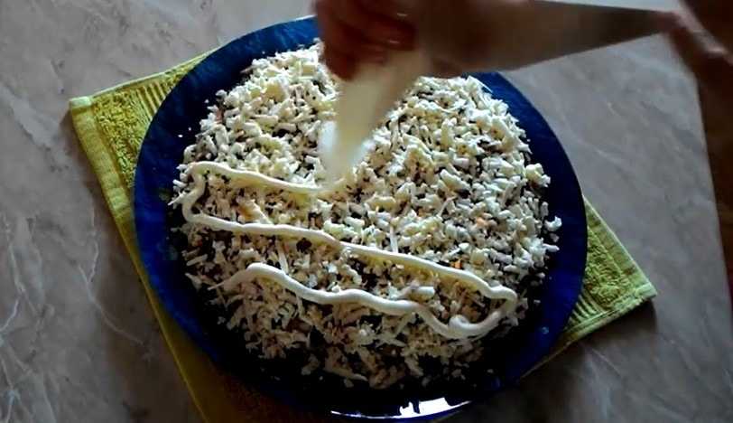 Каждый слой необходимо промазать майонезом по вкусу, а верхний слой посыпать натёртым сыром.