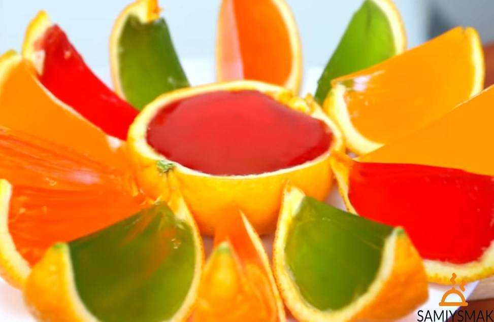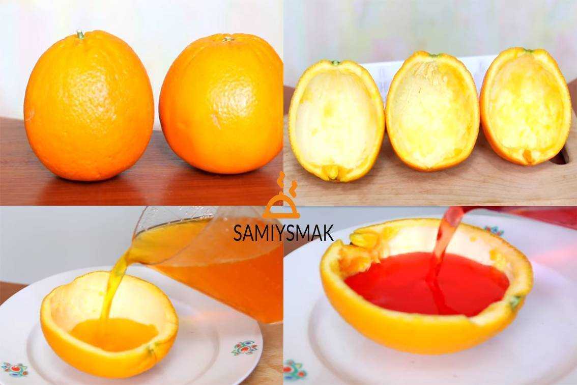 - Из апельсиновых корок получится подобие чашек. Аккуратно налейте желе в кожицу от плодов.