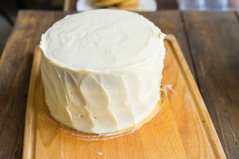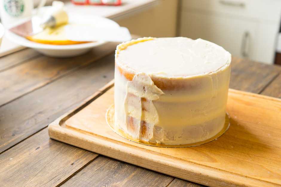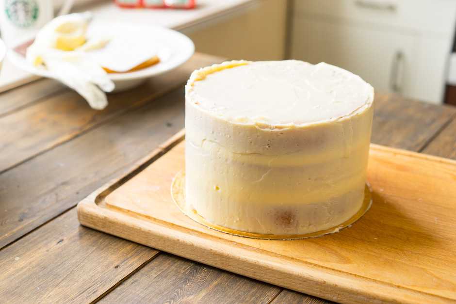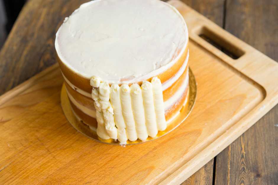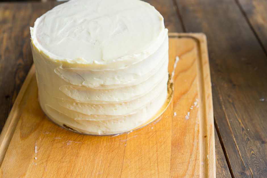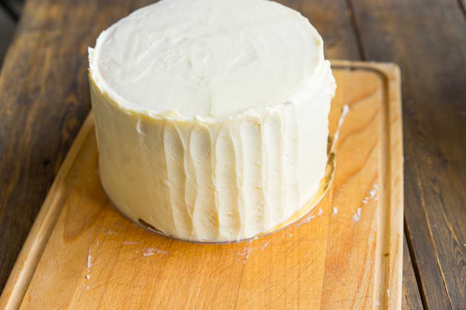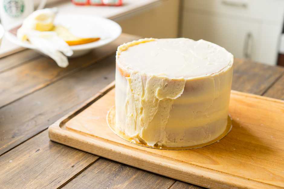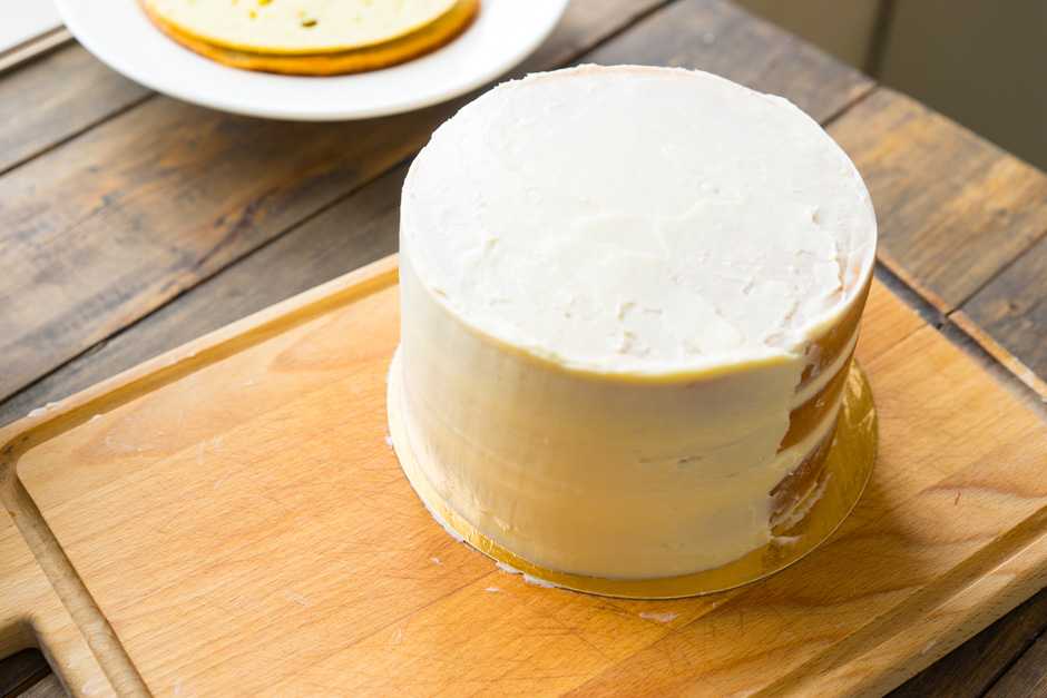 Свежий бисквитный корж идеально подойдет для этой задачи. Его необходимо измельчить в блендере или просто руками до состояния крошки. Затем при помощи ложки или руки равномерно распределите бисквитную крошку по бокам торта.