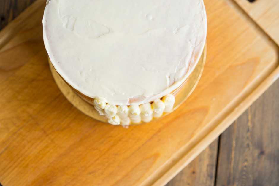 После этого можно украсить торт бордюром из крема, ягодами, фруктами или живыми цветами.