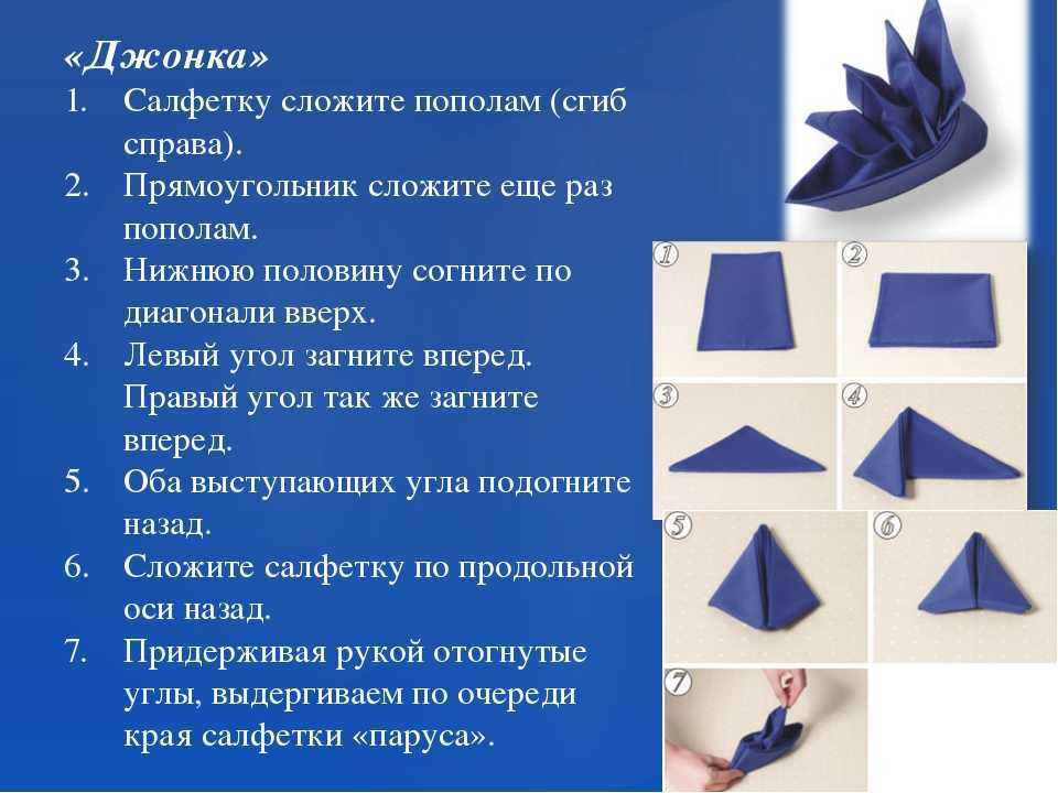 Рассмотреть внимательно каждый шаг важно, когда создаются крупные или модульные фигуры из нескольких салфеток. Не менее важно понять технологию, когда требуется красиво сложить салфетки в причудливый конвертик для столовых приборов