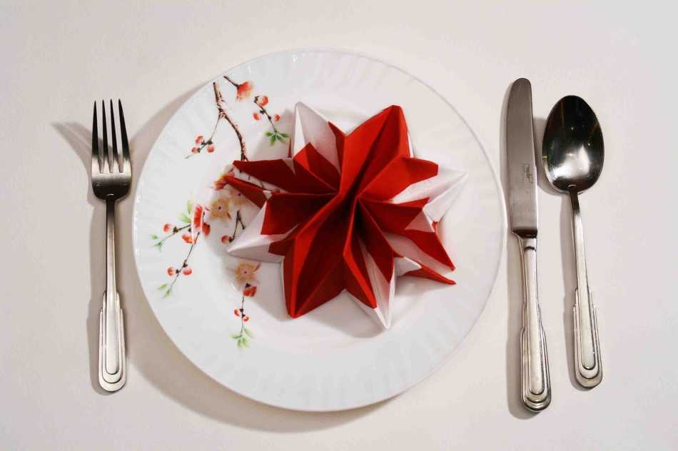 Самый распространенный вариант декора стола – складывание платков при помощи технологии оригами, которая переводится с японского как «сложенная бумага». В данном случае техника подходит не только для бумажных платков, но и для тканевых.