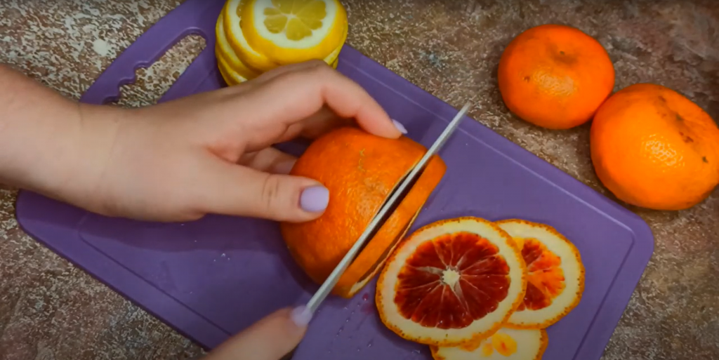 - Далее мандарины надо порезать тонкими кружочками. Будет здорово, если получится сделать их толщиной не более 5 мм. Из мякоти желательно удалить семечки.