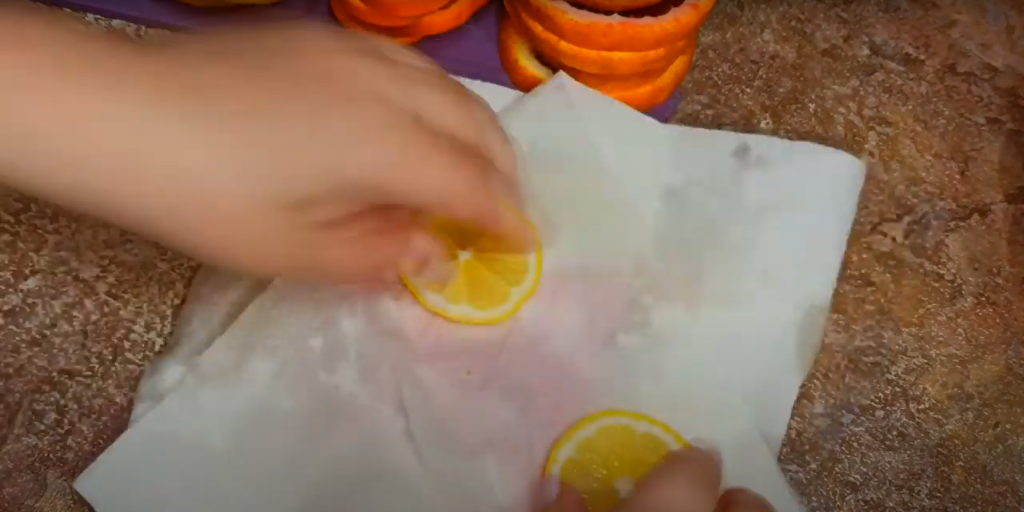 Теперь подготавливаемся к сушке. Мы будем использовать 2 метода – в духовке и на батарее. Предварительно я обтираю цитрусовые салфетками от лишнего сока.