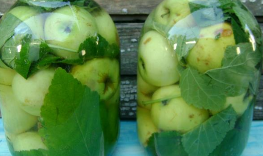 - Плодоножки у яблок можно не отрывать, укладывать кверху «хвостиками».Заготовленные листья замачиваем в воде на пару минут и промываем, обсушиваем. Раскладываем листья первым слоем в подготовленные промытые банки, которые споласкиваем еще и кипятком или прогреваем над паром.