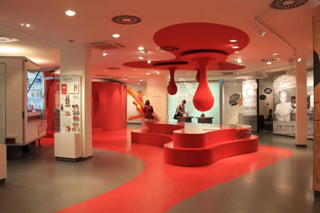 В интерьерах музея – огромные капли кетчупа, словно капающие с потолка, диван в виде гигантской сосиски и двухметровая порция картофеля фри. В качестве культурного развлечения гостям предлагают посмотреть отрывки из фильмов, в которых «снялись» колбаски Currywurst. Можно сфотографироваться с талисманом музея – говорящей ростовой куклой в костюме колбаски. А после насыщенной экскурсионной программы посетителей приглашают на дегустацию колбасок в кафе при музее.