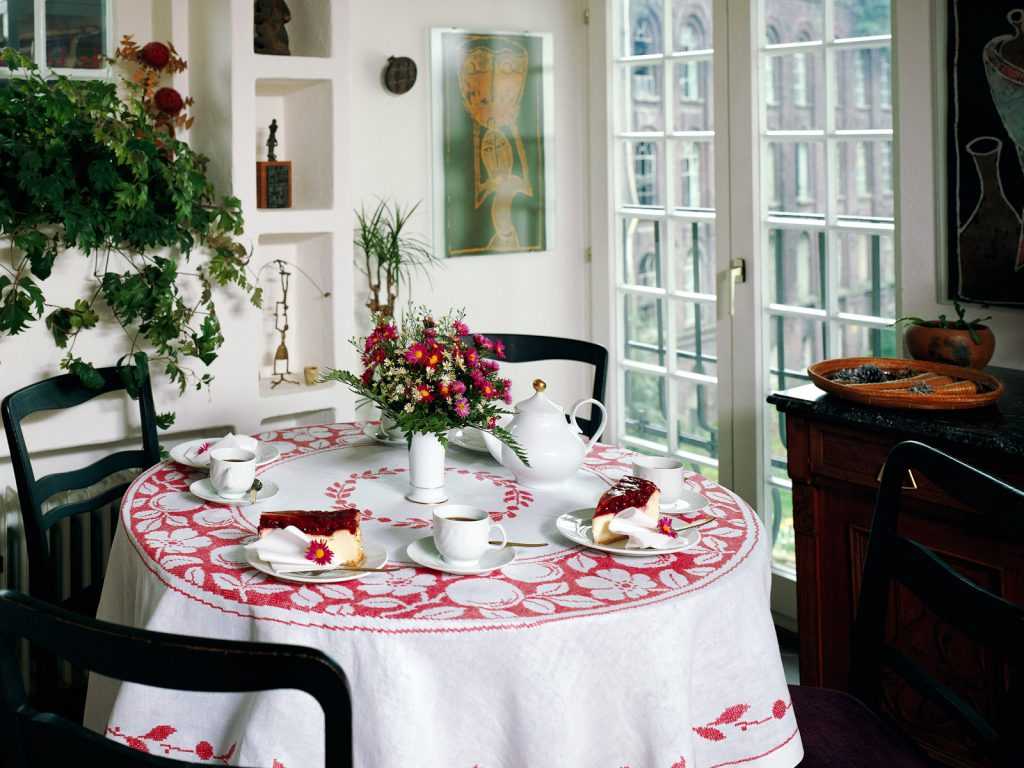 Выбор скатерти для встречи за чаем — дело особое. Если вы выбрали для праздничного случая чайный сервиз с расписными чашками, к нему лучше всего подойдет белое накрахмаленное полотно. Если вы обладатель белоснежного сервиза с золотой каемкой по краю каждого прибора, выбирайте кружевную скатерть. А если планируется чаевничать в компании с самоваром, выбирайте цветастую яркую скатерть с вышивкой.