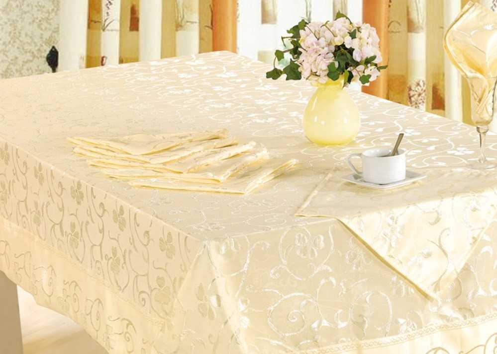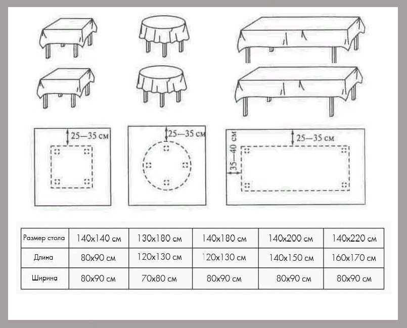 Немаловажным является и размер скатерти. Она должна закрывать края стола и свисать не больше, чем 35 см. Для круглого или овального столика это значение — 25 см. Также рекомендовано выбирать готовые чехлы, которые идеально обхватывают столешницу.