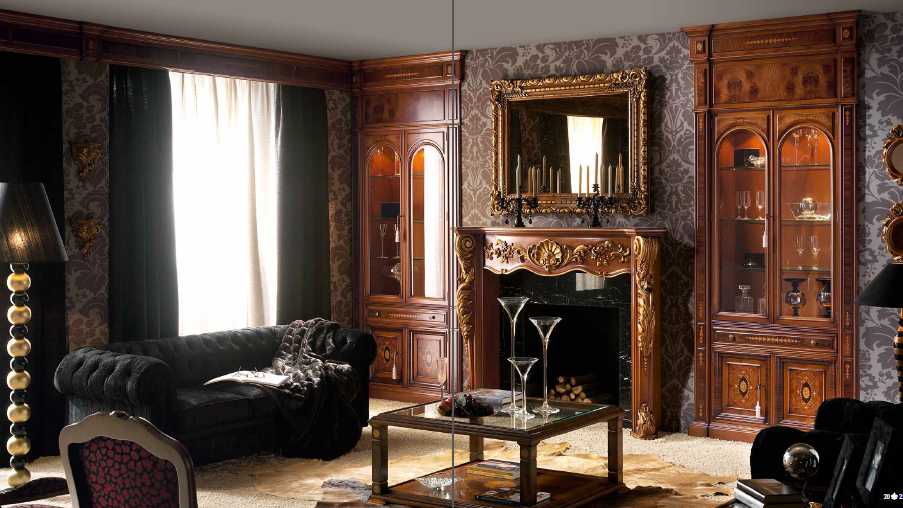 - предметы интерьера используются массивные, с плавными линиями, украшенные резными элементами. Вся мебель выглядит роскошно, а для того, чтобы подчеркнуть натуральную структуру дерева, все изделия тщательно полируют. Кроме резьбы для декорирования также используется фреска. Таким образом, каждый предмет мебели в конечном результате становится настоящим произведением искусства;