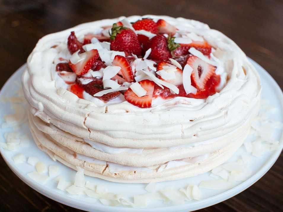 Коржи торта Павловой — это легчайшее безе, перемежающееся взбитыми сливками. Логичное украшение для этого торта — фрукты, цветы, ореховые хлопья.