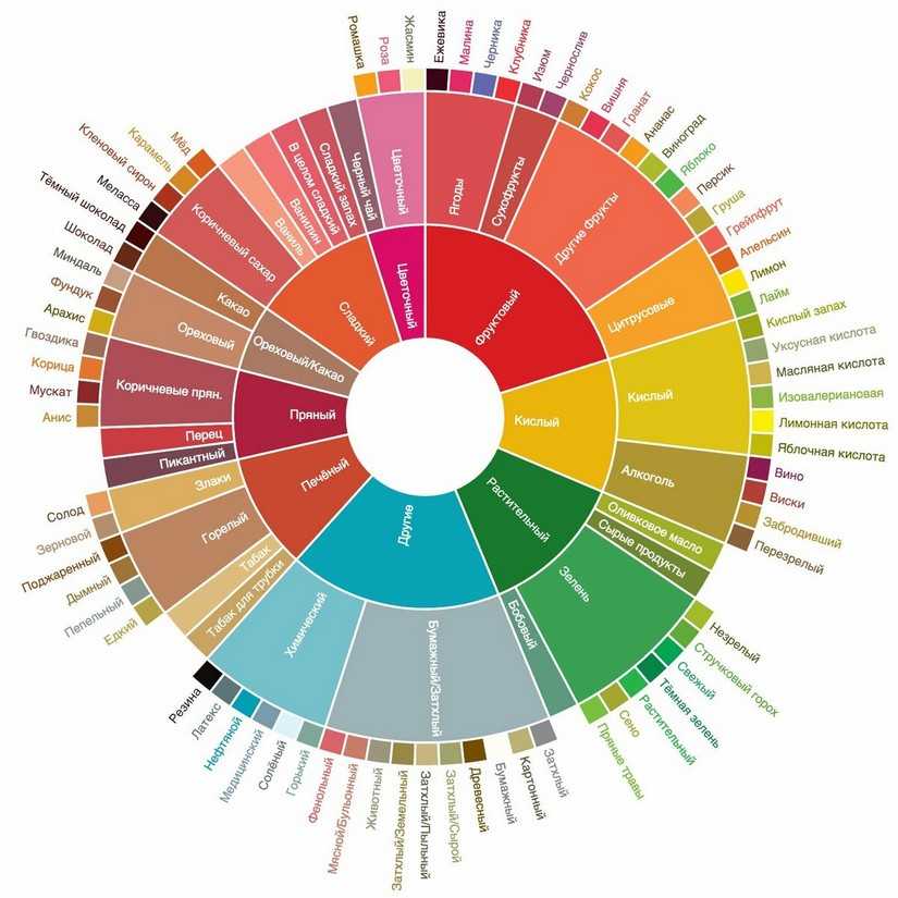 Чтобы специалистам в кофейной отрасли и любителям-энтузиастам легче было договориться о том, как назвать тот или иной оттенок вкуса, члены Американской ассоциации спешелти кофе (SCAA) разработали «Кофейное колесо вкусов». График состоит из кругов, разбитых на сектора. 9 внутренних секторов в центре круга – это базовые определения вкуса: сладкий, цветочный, фруктовый, кислый, растительный, жареный, пряный, ореховый/какао и другой (не слишком лестная характеристика кофе с химическим или затхлым привкусом). Внешняя сторона содержит множество секторов с конкретными дескрипторами.
