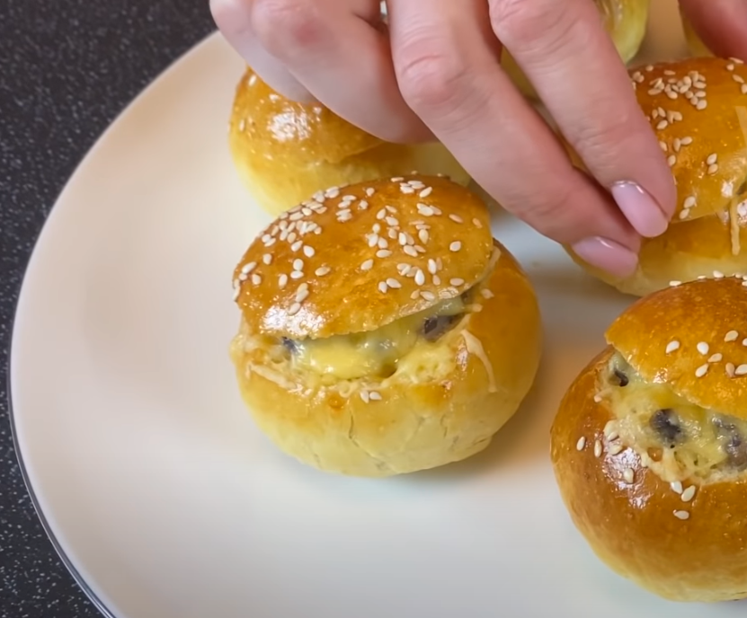 - У булочки срезать верхушку, достать сердцевину. Начинить грибами, сверху посыпать сыром.