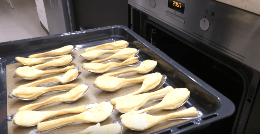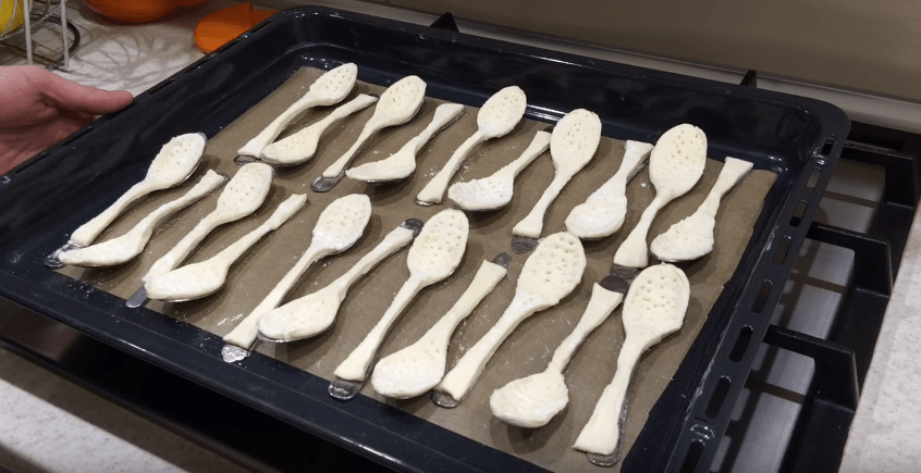 4. На противень кладем бумагу для выпечки, а на нее выкладываем ложки с тестом. Тесто должно лежать на настоящих ложках, чтобы получилась нужная форма. Не переживайте, с ними ничего не случится.