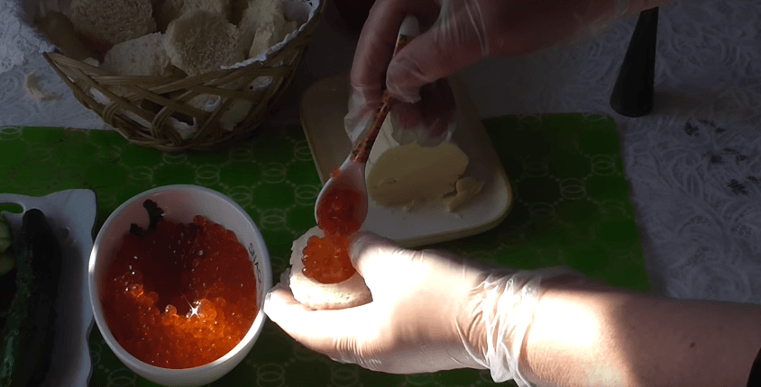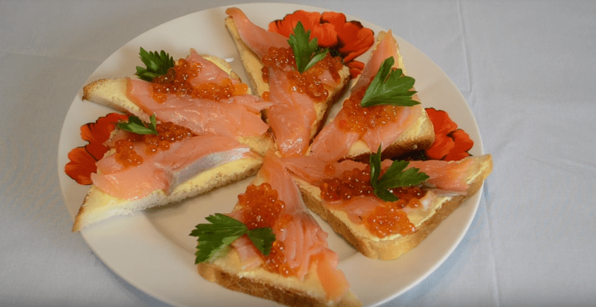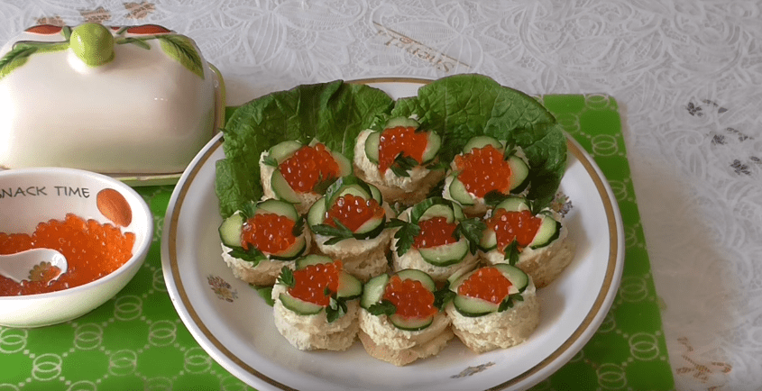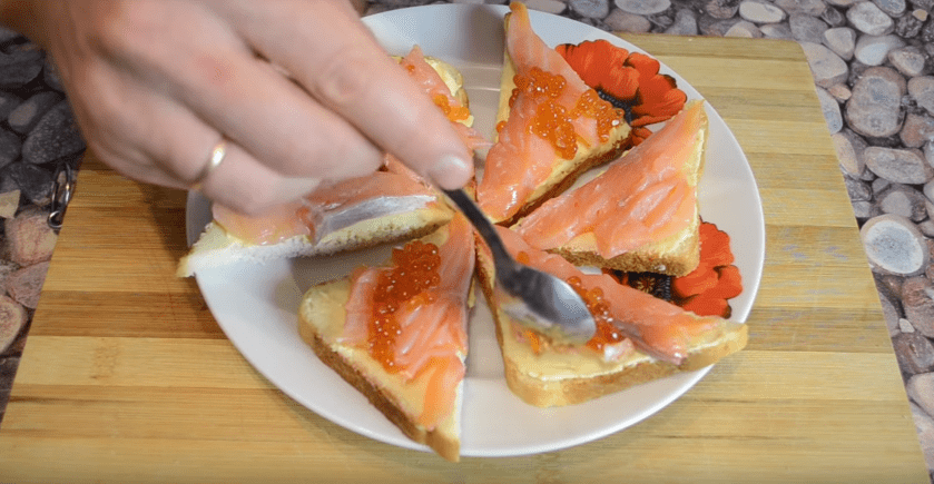 Следующая обширная группа закусок — это бутерброды с красной икрой. Икра имеет свой собственный особенный вкус и ее редко смешивают с чем-то еще. Чаще всего она идет как главный элемент, а оттеняется ее вкус чаще всего сливочным маслом.