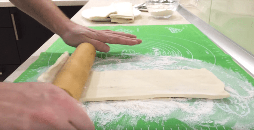 1. Берем кусок купленного размороженного слоеного теста (обычно упаковываются куски по 200- 250 гр) и раскатываем его буквально раза 3, чтобы получился кусок толщиной в пол сантиметра.