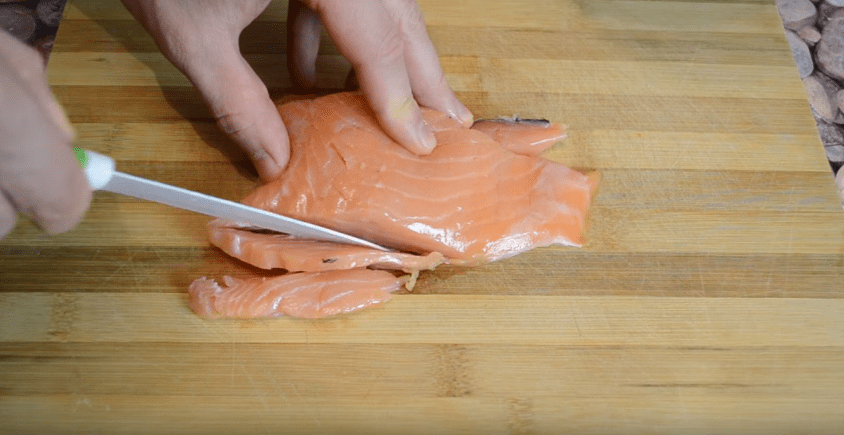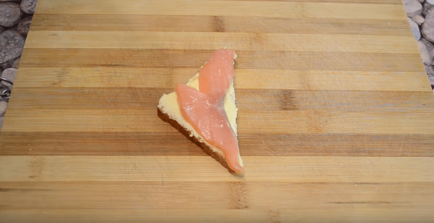 - Одну часть посыпьте измельчённым укропом и сверху положите тоненький ломтик красной рыбы.