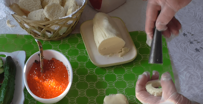 4. Кладем кольцо на цельный кусок батона и получается корзинка, в которую мы накладываем икру.