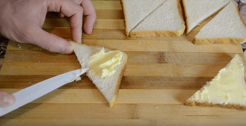 2. Закуска будет состоять из двух половинок батона. Оба нужно намазать сливочным маслом.