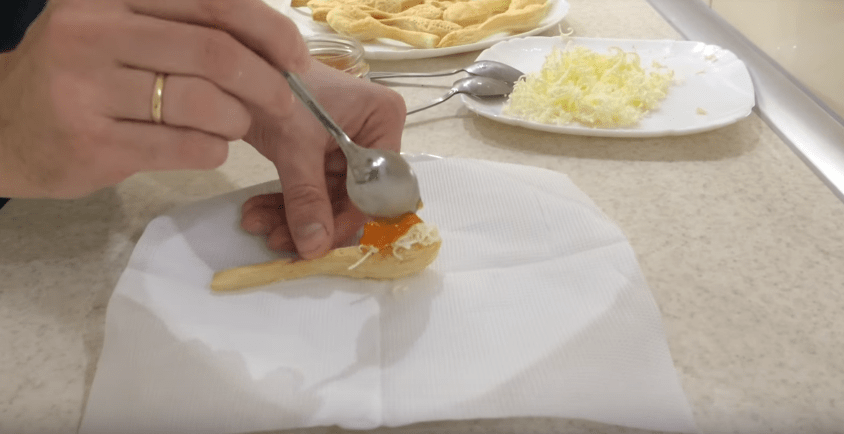 3. Получившуюся заготовку прикладываем к ложке и приминаем тесто, чтобы оно приобрело форму и углубление ложки.