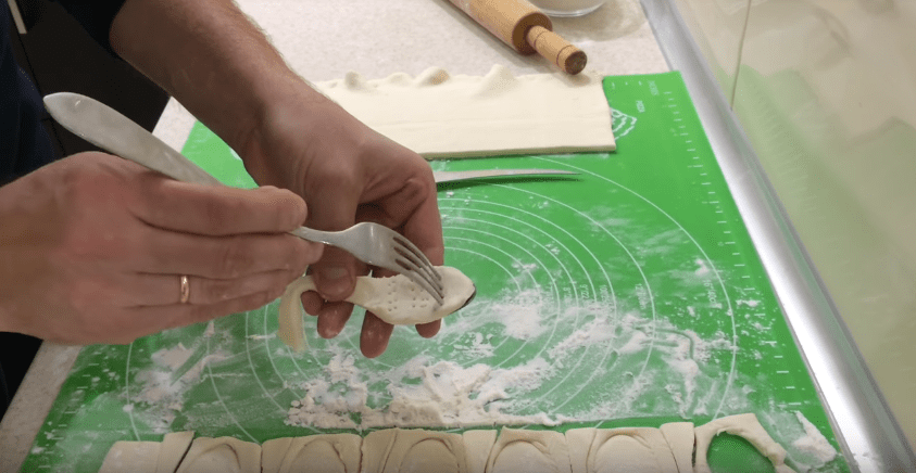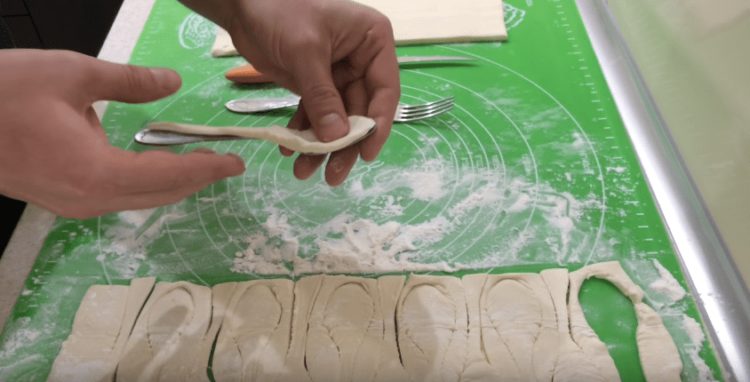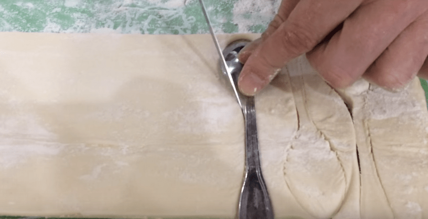 2. Затем берем столовую ложку, прикладываем к тесту и, используя ее как шаблон, вырезаем ее контур на тесте ножом.