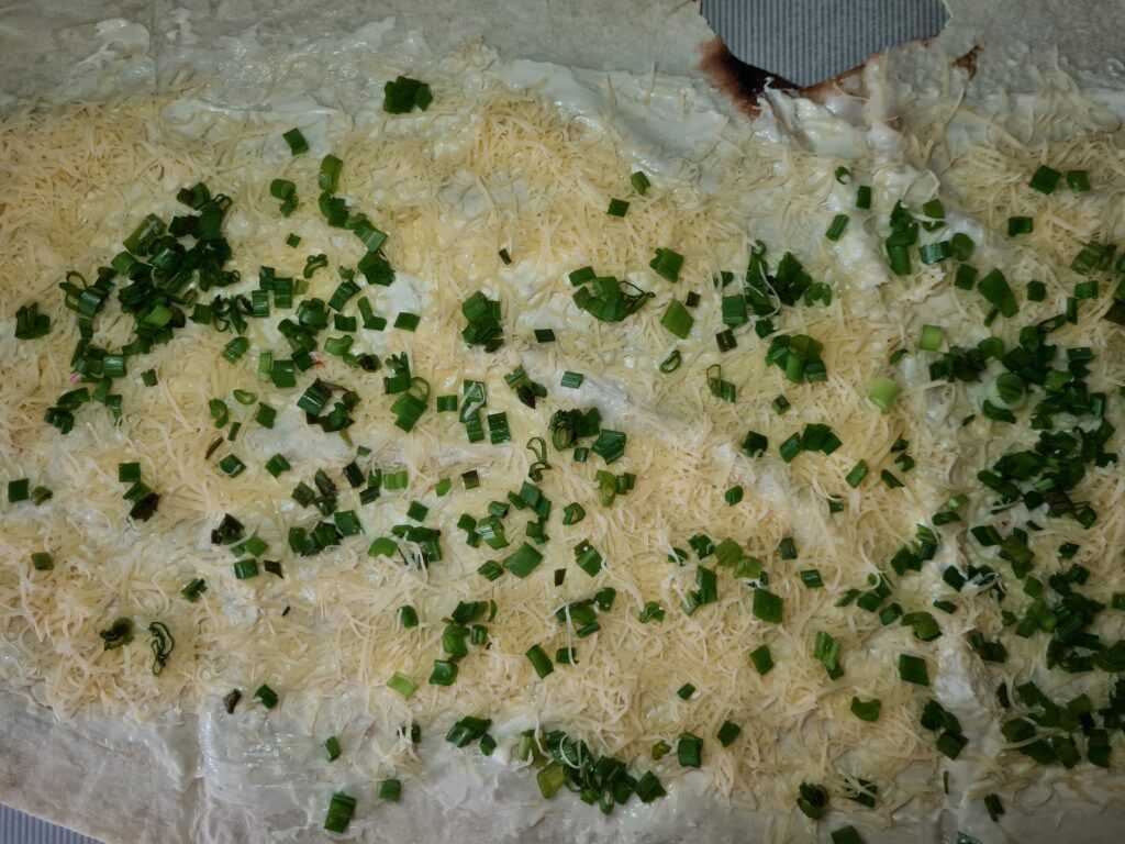 Взять второй лаваш. Также смазать его майонезом. Посыпать тёртыми яйцами и нарезанным мелко зеленым луком.