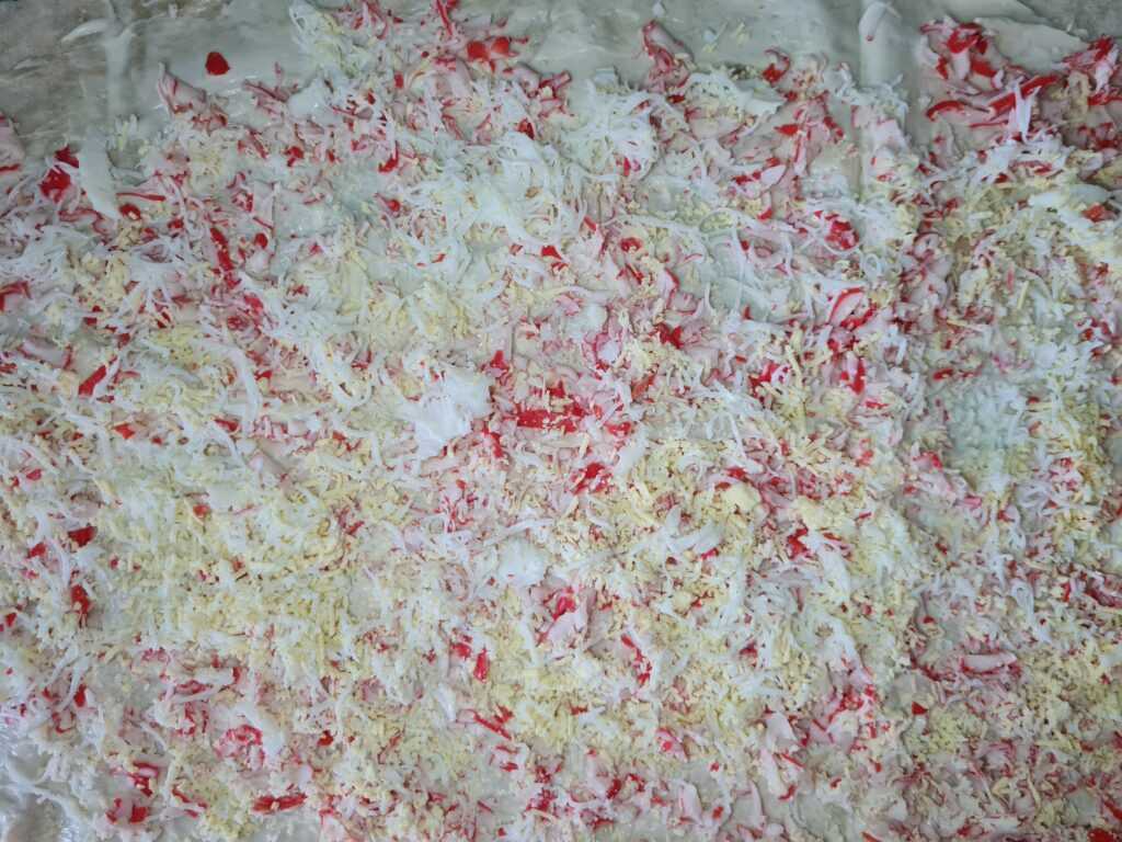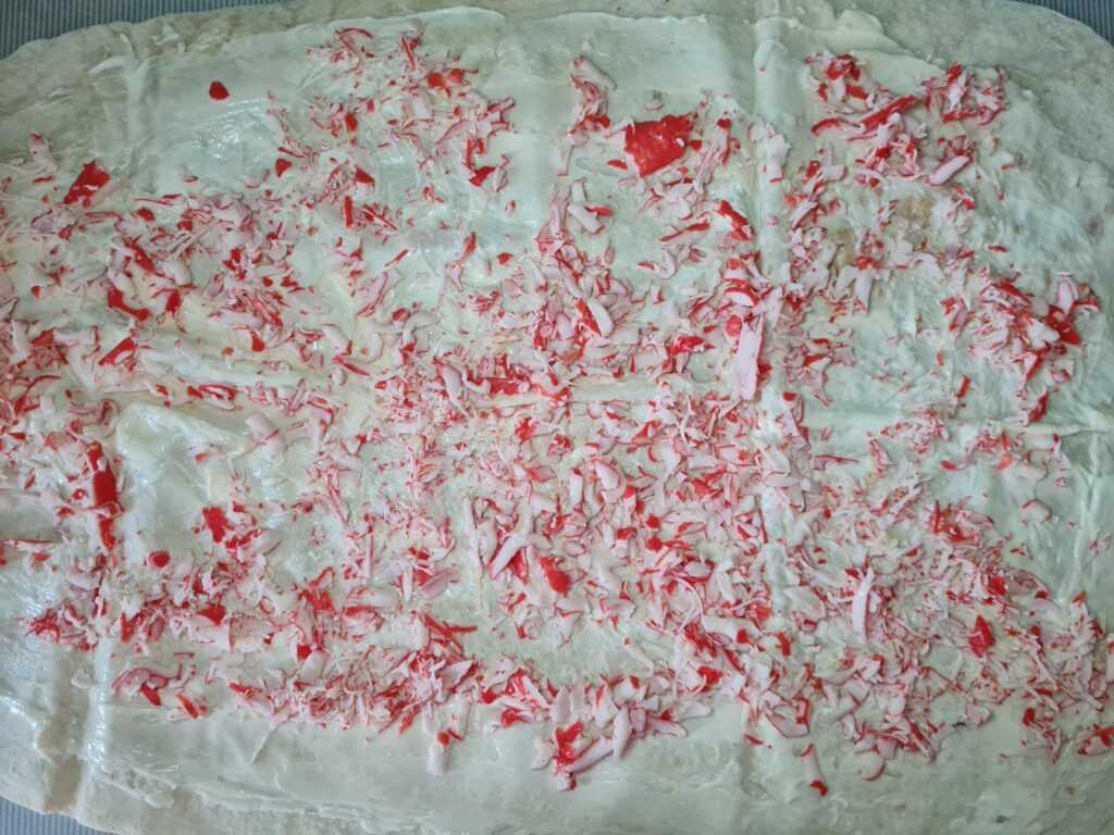 Лаваш расстелить на столе. Смазать майонезом и посыпать тёртыми крабовыми палочками.