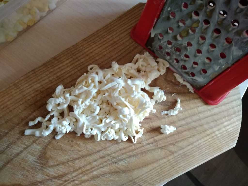 - Натрите сыр на мелкой терке. Масло предварительно размягчите, добавьте в емкость с маслом желтки и горчицу. Взбейте до однородной консистенции.