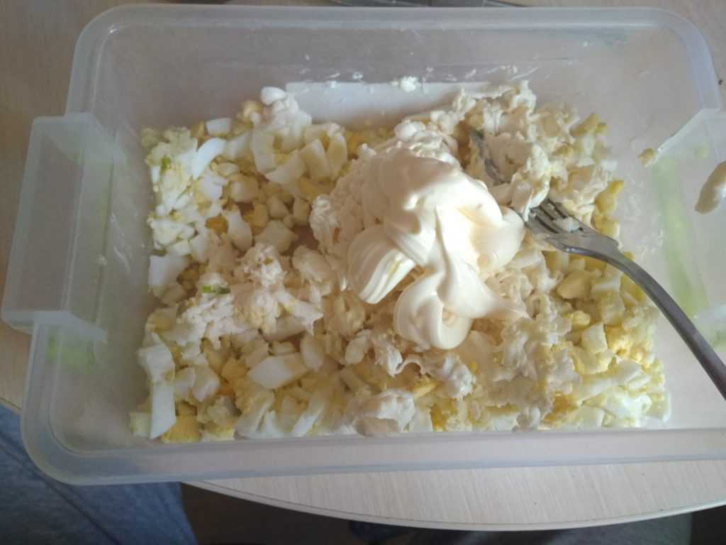 - Все компоненты сложите в емкость. Добавьте майонез по вкусу.