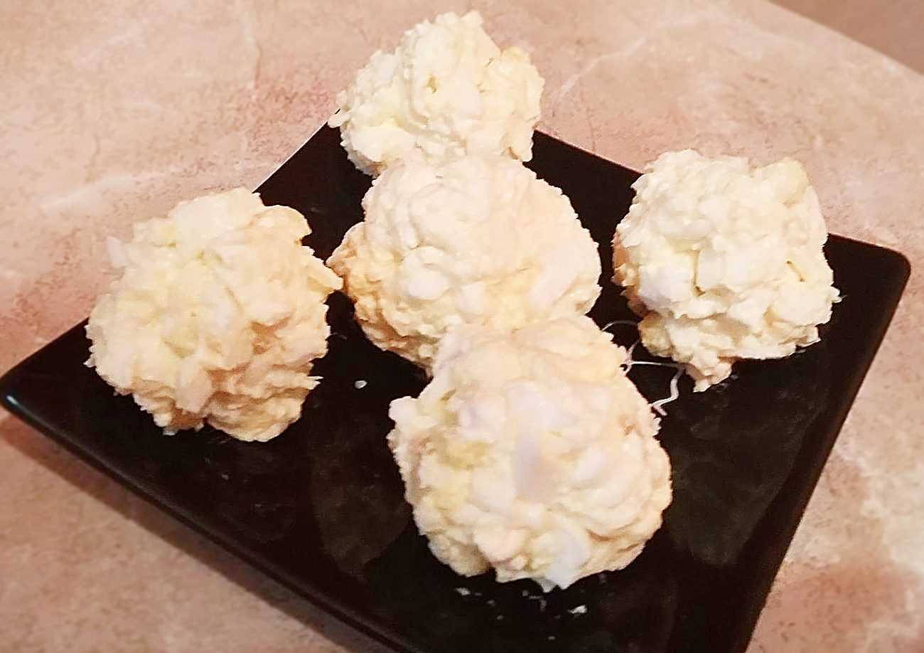 Белки от яиц поочередно обмакиваем сначала в муку, затем в яйцо и в конце в молотые сухари. Выкладываем на разогретую сковороду и обжариваем во фритюре — в большом количестве растительного масла. Готовые половинки белков выкладываем на бумажную салфетку, чтобы стек жир.