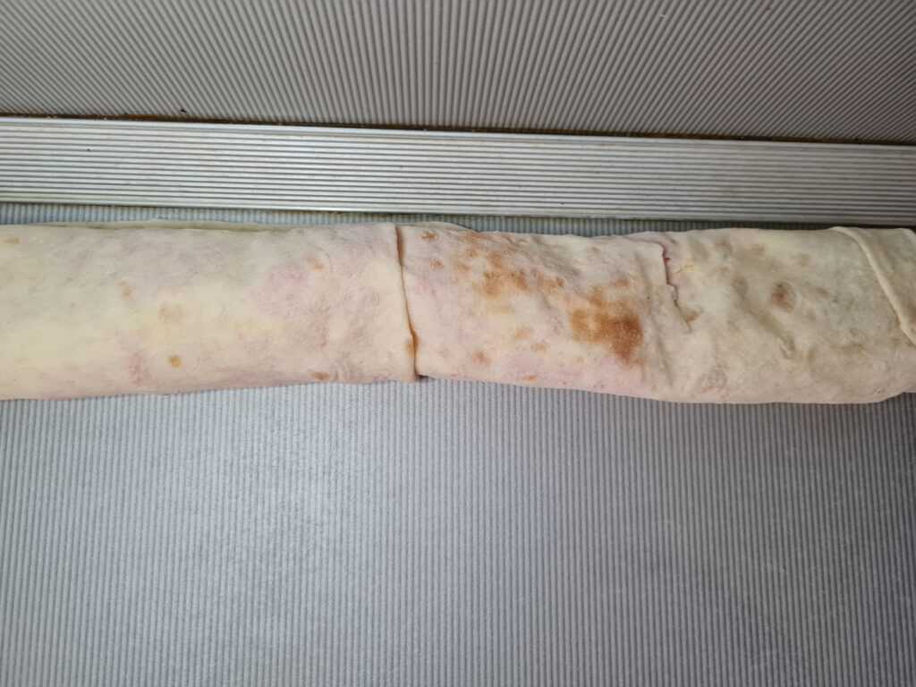 Затем взять предыдущий рулет и завернуть его в этот. Затем разрезать на две части, чтобы было удобнее хранить в холодильнике. Положить в пакет или замотать в фольгу. Оставить в прохладном месте, чтобы лаваш пропитался. Затем достать и нарезать на порционные кусочки.
