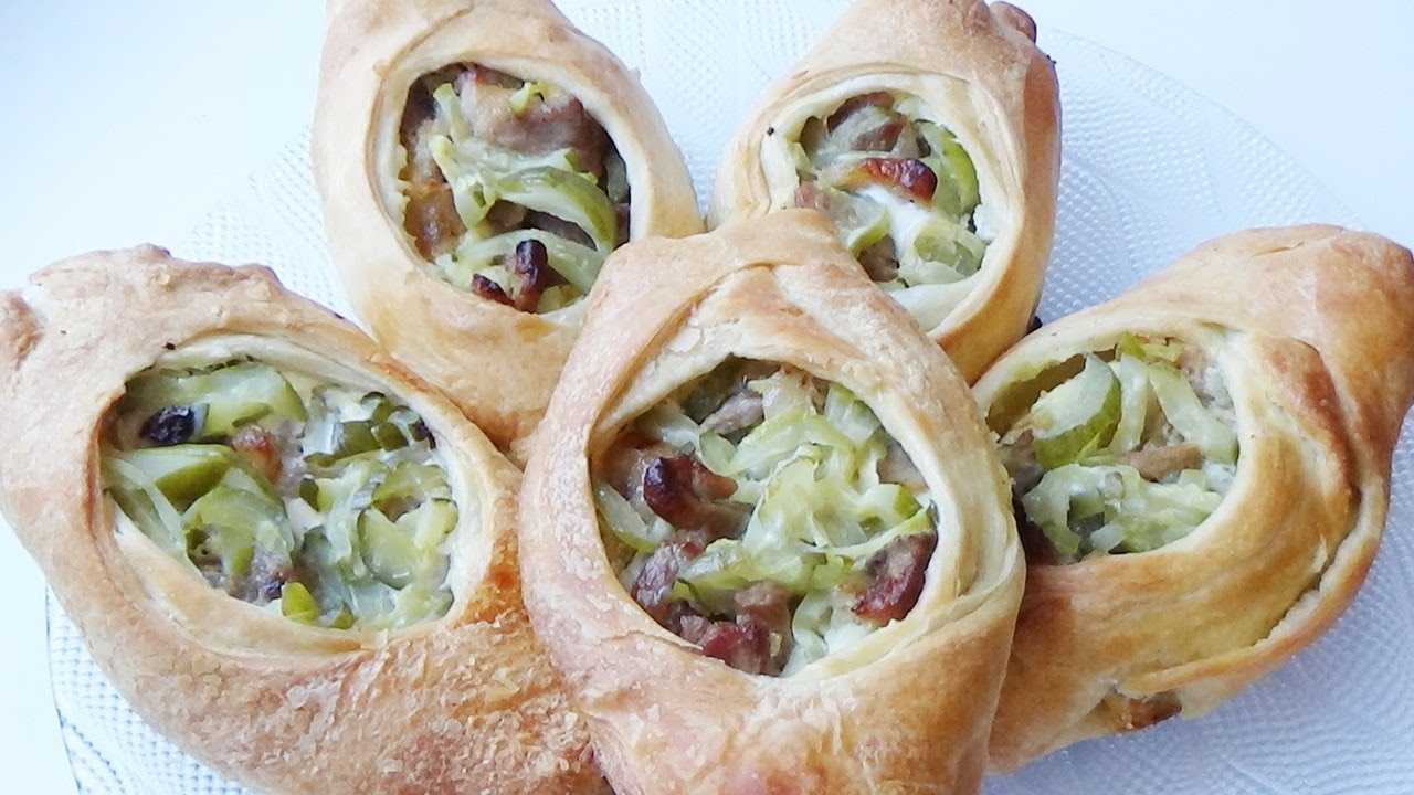 - Тесто слегка надрежьте по бокам и сверните лодочки. Выложите лодочки на покрытый пергаментом противень, смажьте яйцом и выпекайте в разогретой до 200 градусов духовке в течение 12-15 минут. Подавайте со свежей зеленью.