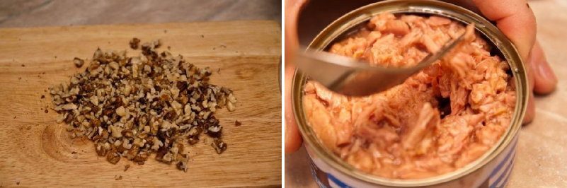 - Добавляем к салату измельченное филе рыбы и подготовленные овощи.
