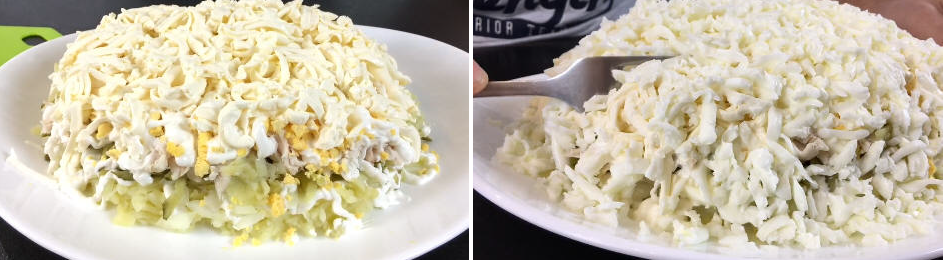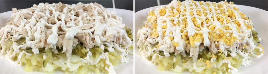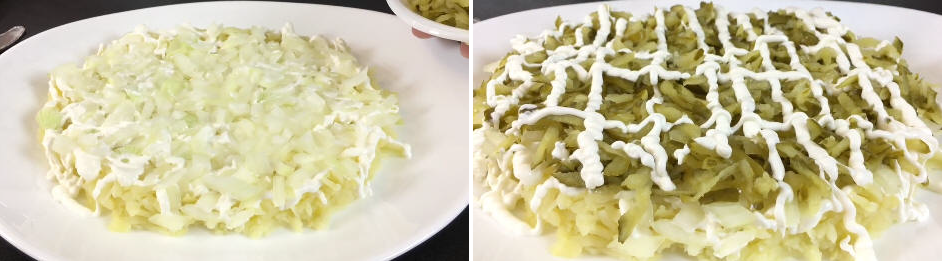 Далее — маринованный лук и слой натертых огурцов + майонезная сеточка