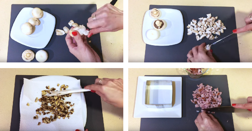 Я же обычно просто счищаю верхнюю кожицу с грибочков — мне не трудно:) Затем крошу мелкими кубиками, обжариваю на сковороде в растительном масле и откидываю на салфетку. Оставляю остужаться.